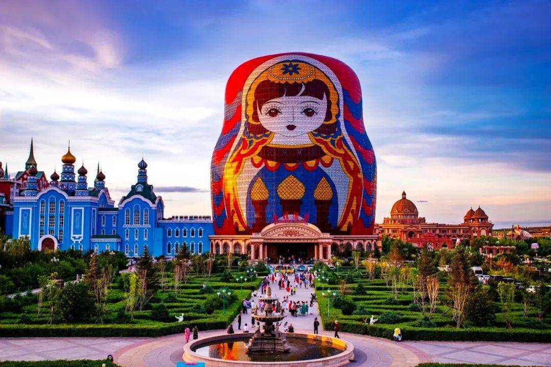 这里有中、俄、蒙三国风情。统共这个词景区由主题园区、主题文娱、主题栈房三部分组成。