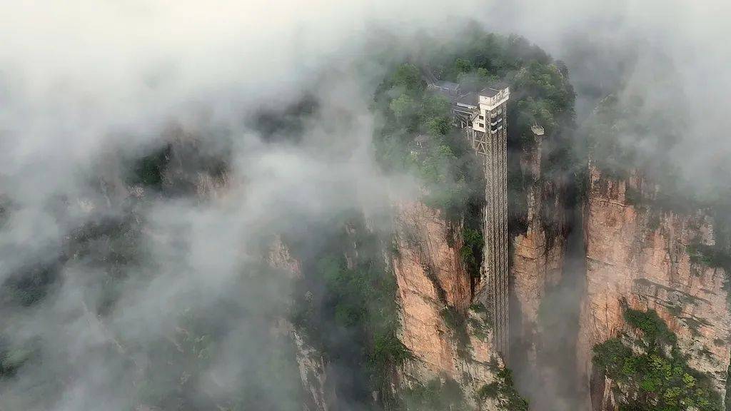当电梯以每秒5米的速率穿云破雾时,乘客可在约65秒的驰魂宕魄中,感受石英砂岩峰林从眼下掠过,直抵云端的视觉奇不雅。