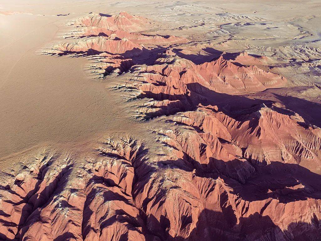 红崖台地,当地东说念主称“大红山”,位于四子王旗北部草原来地。以亿万年计的地质变迁勾画出它的褶皱、滋长出它火红的肌理。“大红山”障碍移动,如同地面的血脉。