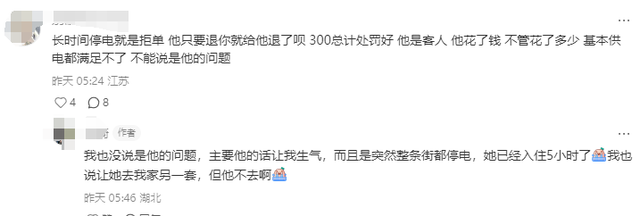 但批驳区网友一语戳破,称这五个小时里有三个小时皆处于停电状态,宾客思要退款统统不错合资,房主倒是先屈身上了。