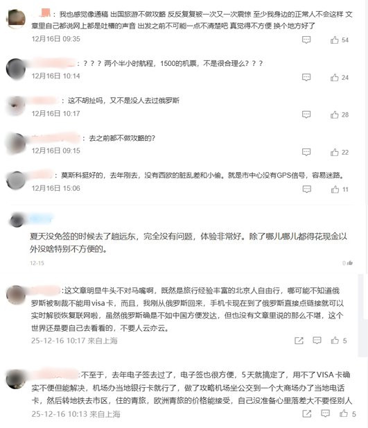 不雅察者网在应酬平台发现,有网友透露“夏天没免签的时刻去了一回远东,十足莫得问题,体验十分好。除了浮滥需要使用现款除外没啥止境不方便的”“用不了VISA卡照实未便但能贬责,机场办当地银行卡就行了,我方没准备、心里落差大不要怪别东谈主”“莫斯科挺好的,旧年刚去,莫得西欧的脏乱差和小偷,便是市中心莫得GPS信号,容易迷途……”
