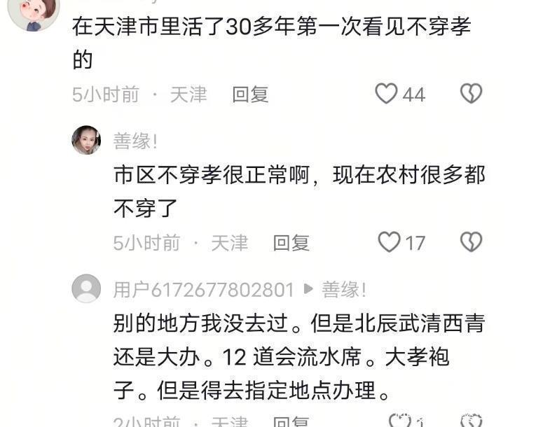 有个天津的网友说,其真实天津市区不穿孝服挺广阔的,当今农村里好多东谈主也齐不这样谨慎了。