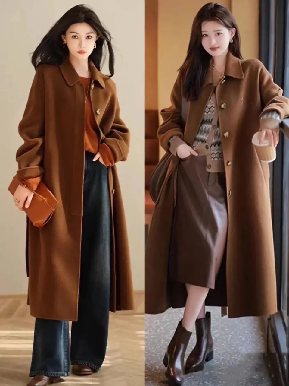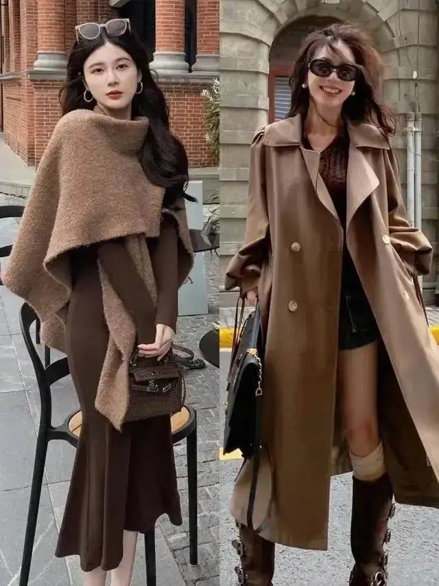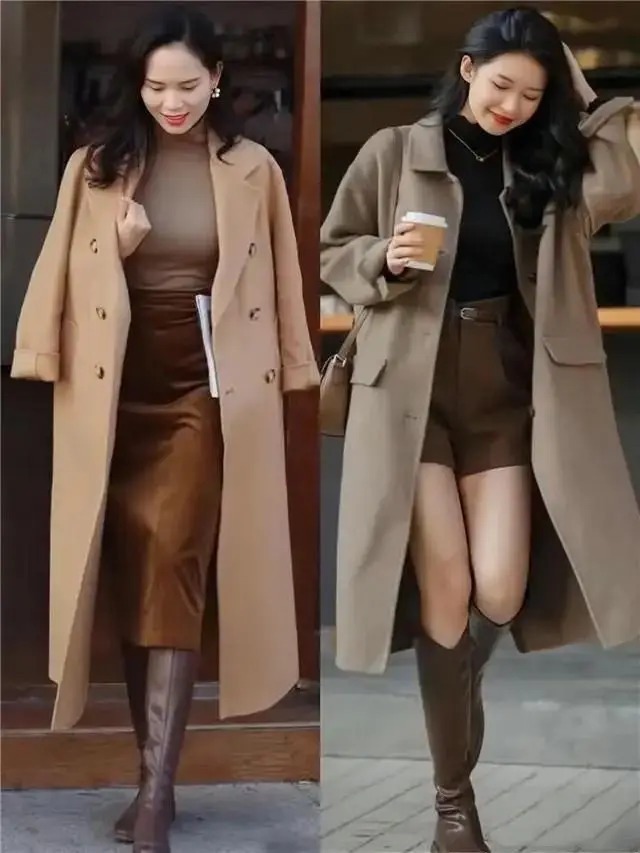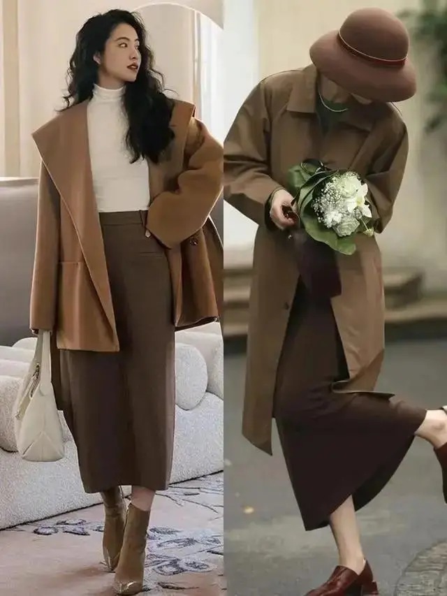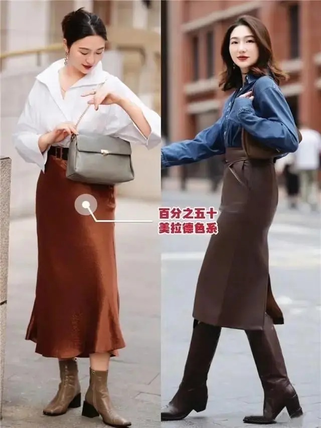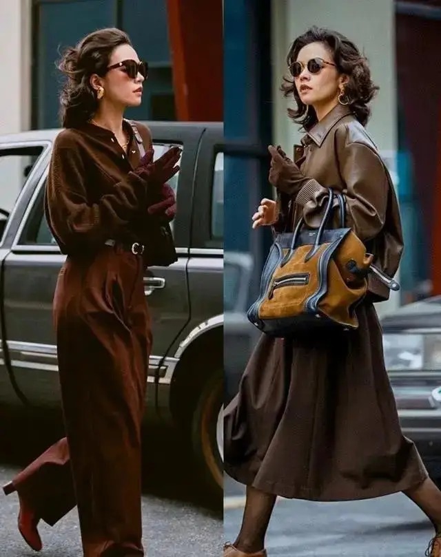 确乎,好意思拉德色系的大衣外衣搭配上相似是好意思拉德色系的皮质半身裙,还有短靴,看起来就有一种不菲感,会相比上档次,这亦然为何这几年相称流行这个色系的原因之一,最主要的还有相比百搭耐看。