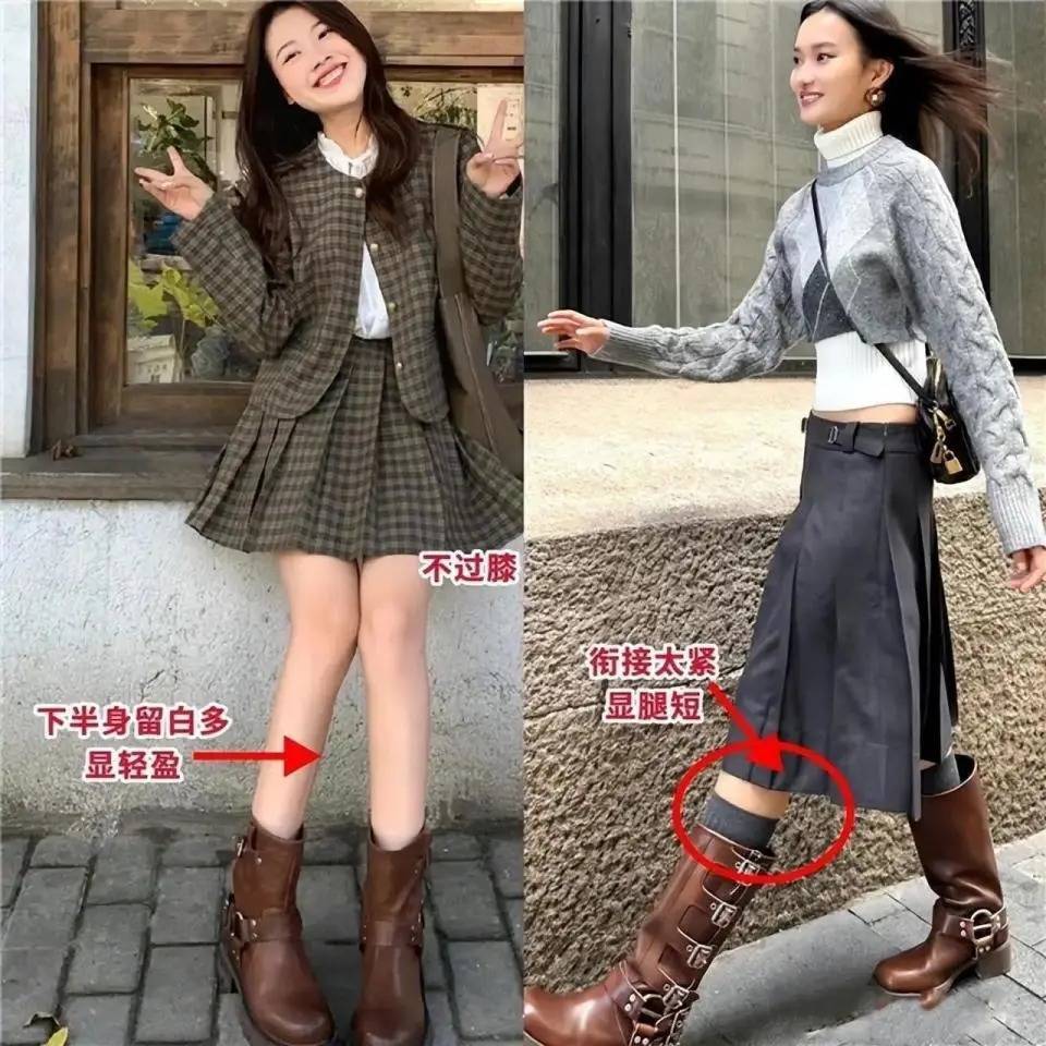 举例底下这两位达东谈主用的即是好意思拉德色系的短靴,搭配上格纹半身裙,还有格纹的小外衣,这么的穿搭,下半身留白较多,显得轻微,让你看起来更有活力。